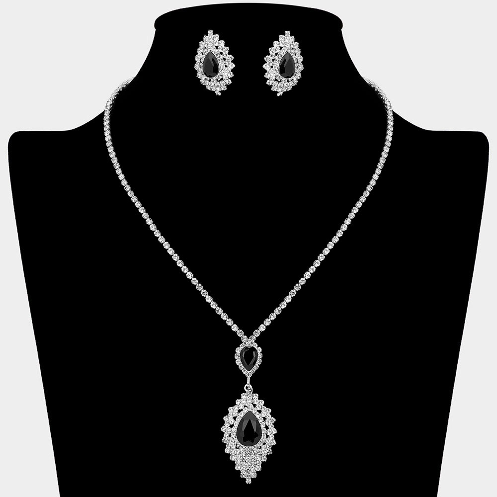 • Elegant teardrop crystal necklace with matching earrings featuring a double halo design and sparkling accents. A refined jewelry set ideal for weddings, proms, evening events, or adding sophistication to formal looks.