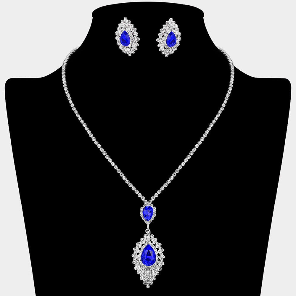 • Elegant teardrop crystal necklace with matching earrings featuring a double halo design and sparkling accents. A refined jewelry set ideal for weddings, proms, evening events, or adding sophistication to formal looks.