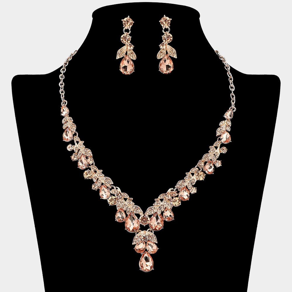Details • Necklace Size : 19" + 3" L • Decor Size : 1.6" L • Earrings Size : 1.6" L • Dazzle with sophistication in this crystal drop necklace and earring set, designed for weddings, formal events, or glamorous evenings. The intricate detailing and sparkling stones create a timeless, luxurious look that enhances any outfit with elegance and radiant charm.