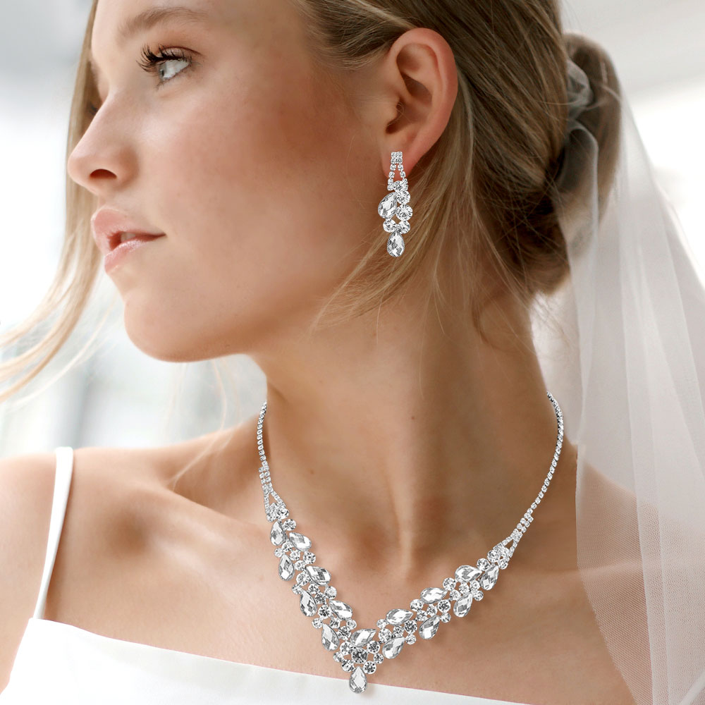 • Elegant jewelry set featuring a rhinestone-encrusted necklace and matching earrings with teardrop-shaped accents. Designed to shine at formal events, weddings, or special evenings, this set adds glamour and sophistication with its detailed sparkle and refined silhouette.