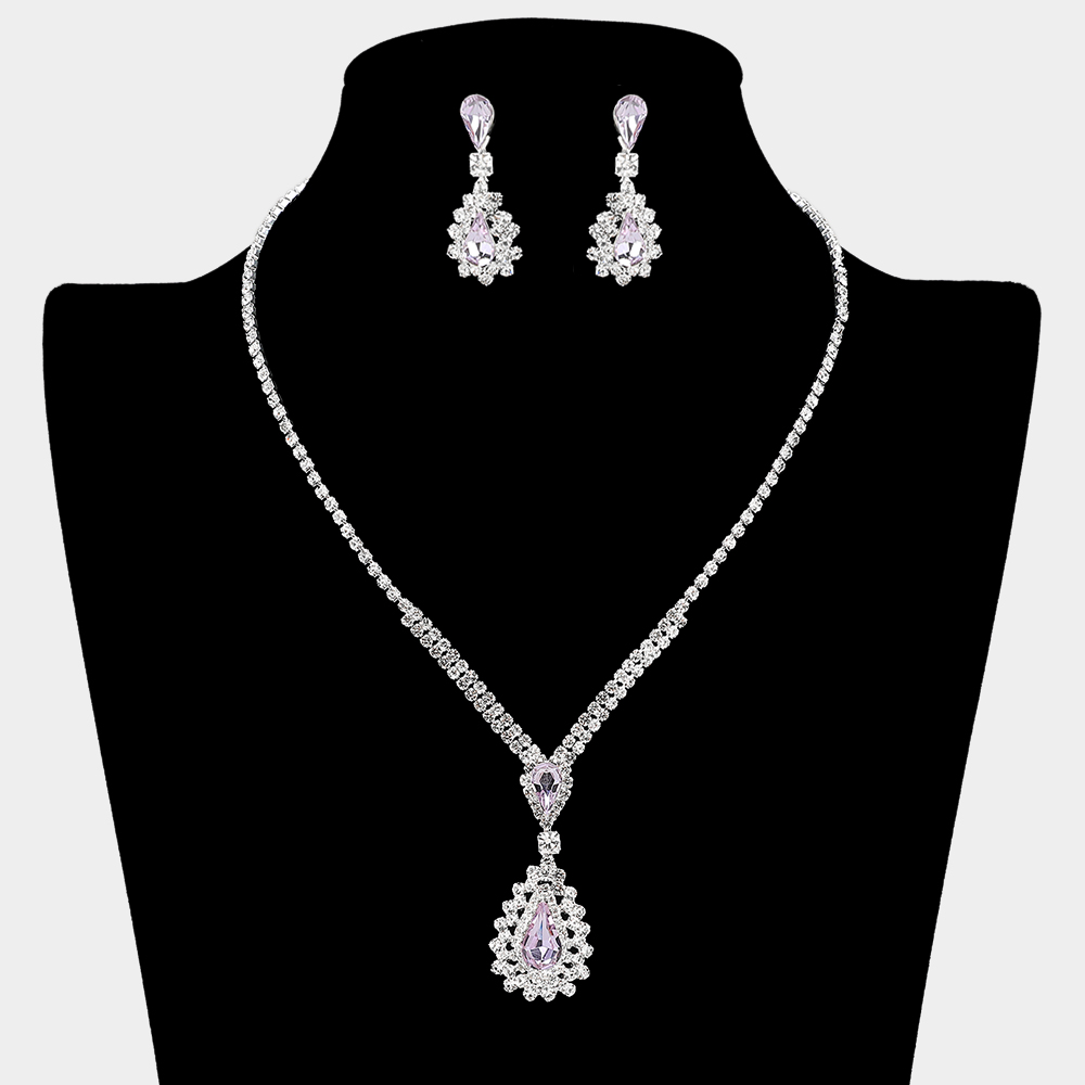 • Elevate special occasion style with this sparkling jewelry set featuring a teardrop pendant and coordinating earrings adorned with radiant rhinestones. Designed to catch the light beautifully, this elegant set adds a refined, glamorous finish to evening looks, weddings, and formal celebrations.
