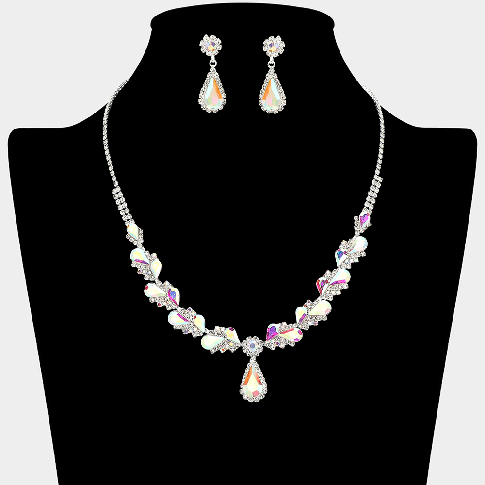 • This teardrop statement necklace and earring set features layered sparkle with elegant drop accents that frame the neckline beautifully. Designed for special occasions, formal events, and evening styling, it offers a refined coordinated look ideal for boutiques and gift-ready collections.
