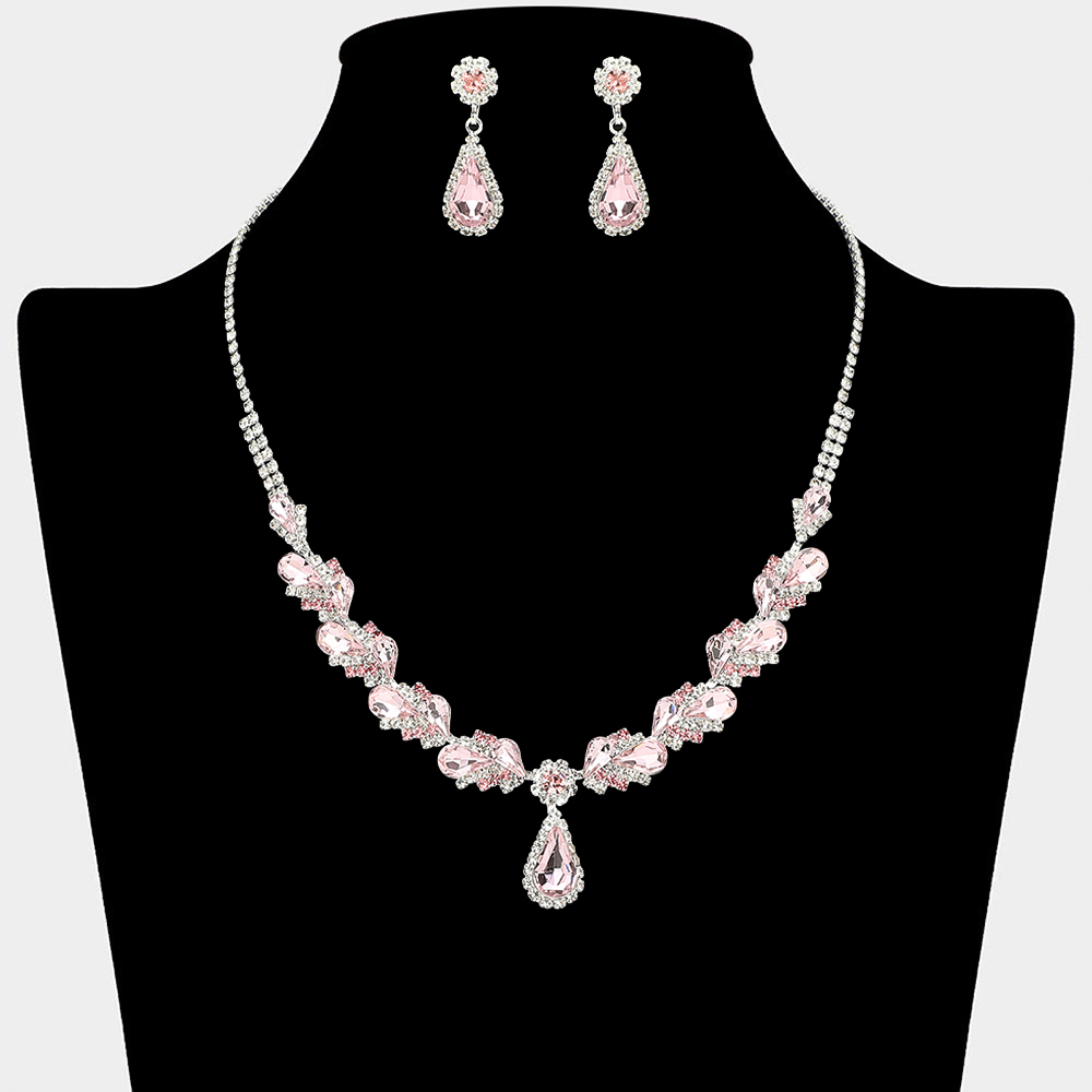 • This teardrop statement necklace and earring set features layered sparkle with elegant drop accents that frame the neckline beautifully. Designed for special occasions, formal events, and evening styling, it offers a refined coordinated look ideal for boutiques and gift-ready collections.