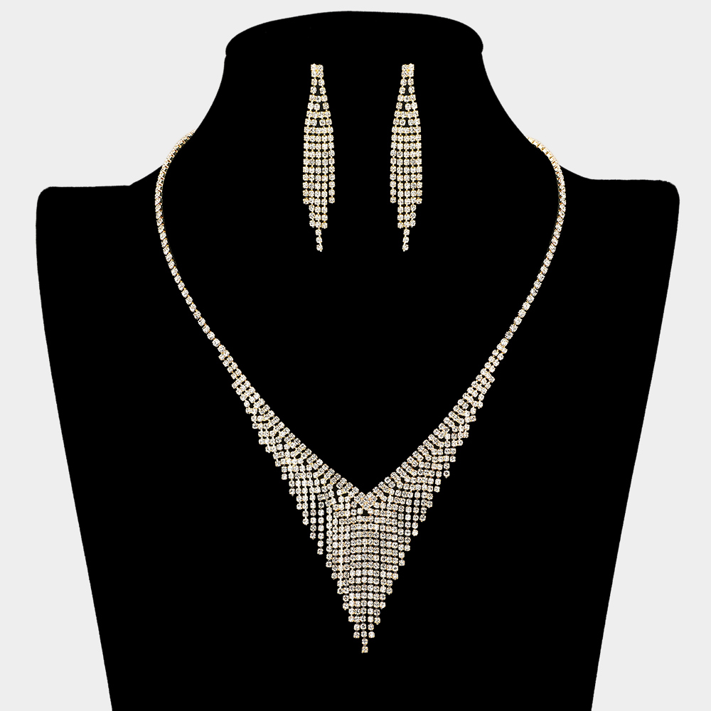 Details • Necklace Size : 16" + 4.25" L • Decor Size : 1.75" L • Earrings Size : 2.1" L • Make a striking entrance with this elegant jewelry set showcasing a dramatic triangular cascade of shimmering stones and matching long drop earrings. Perfect for weddings, galas, proms, and evening events, it offers a glamorous, eye-catching finish that enhances any formal style. • Lead and Nickel Compliant