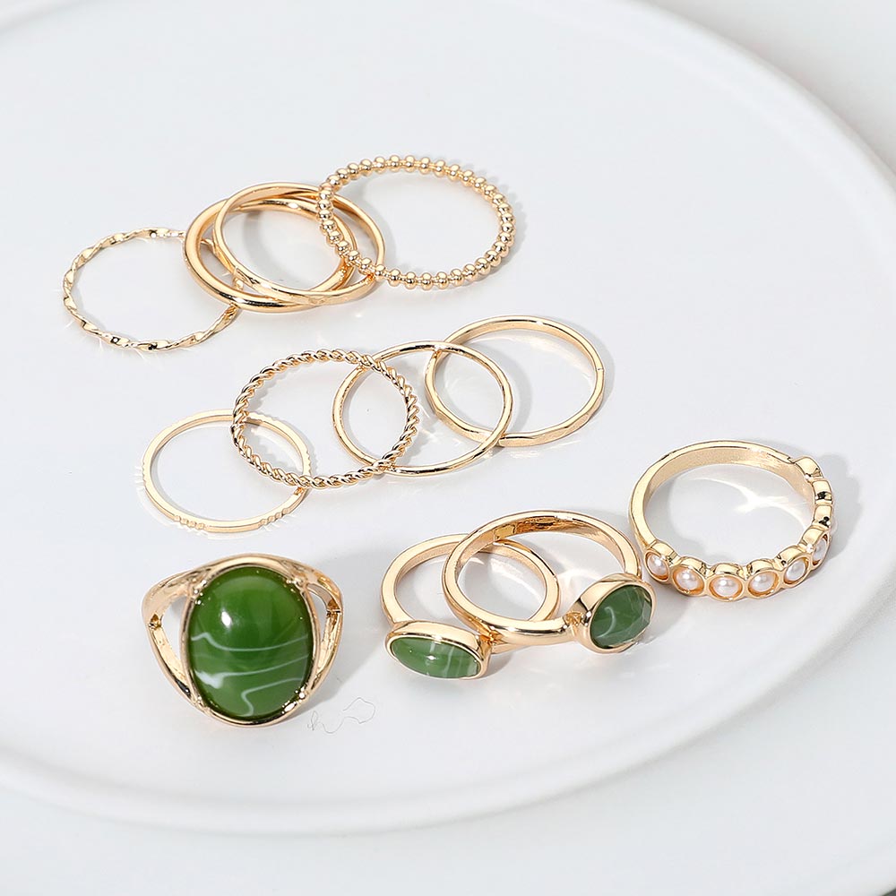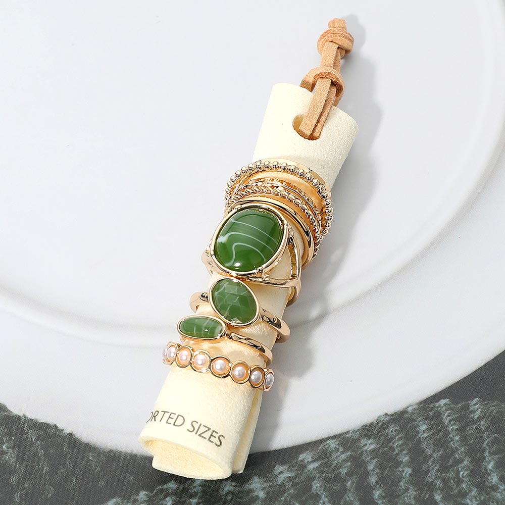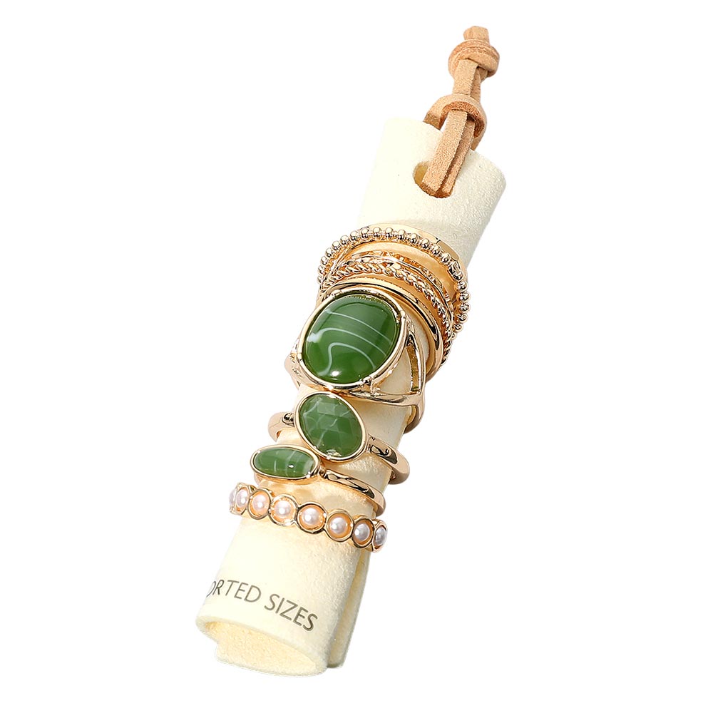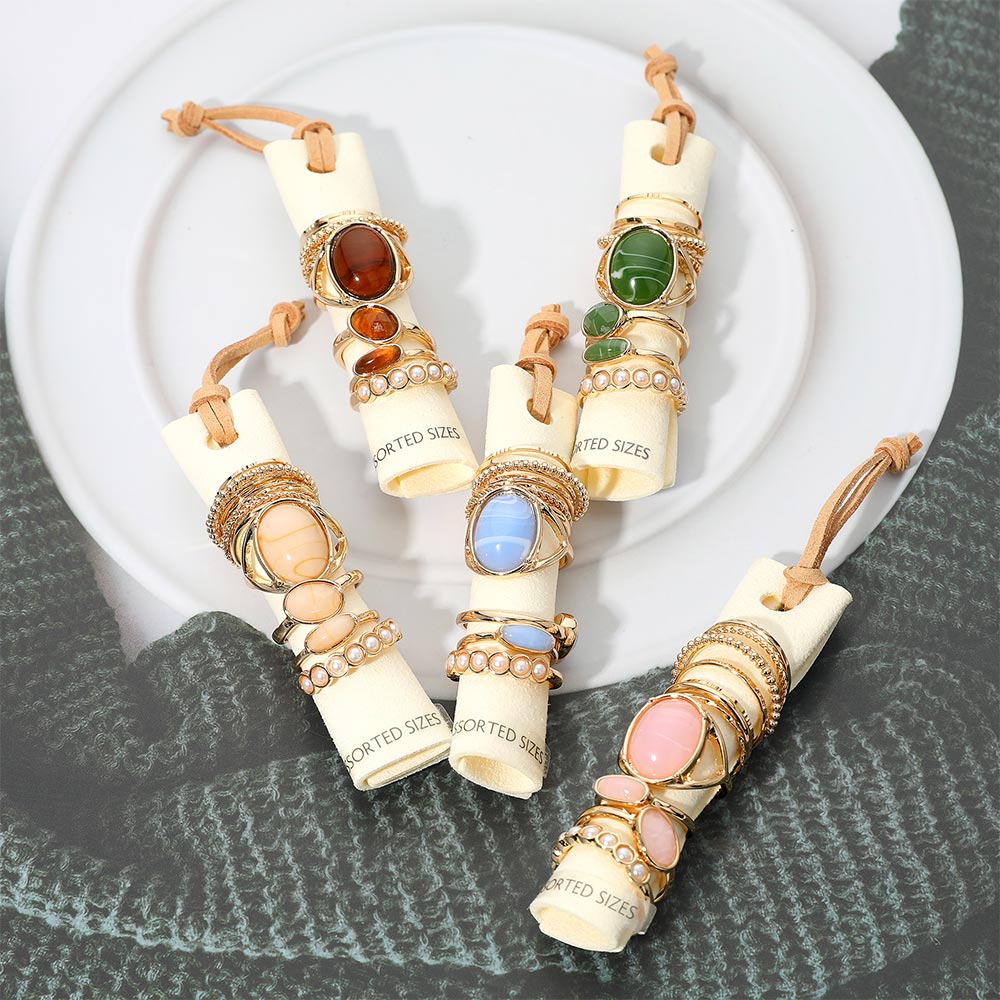 12PCS - Assorted Resin Stone Accent Pearl Link Textured Metal Stackable Ring Set