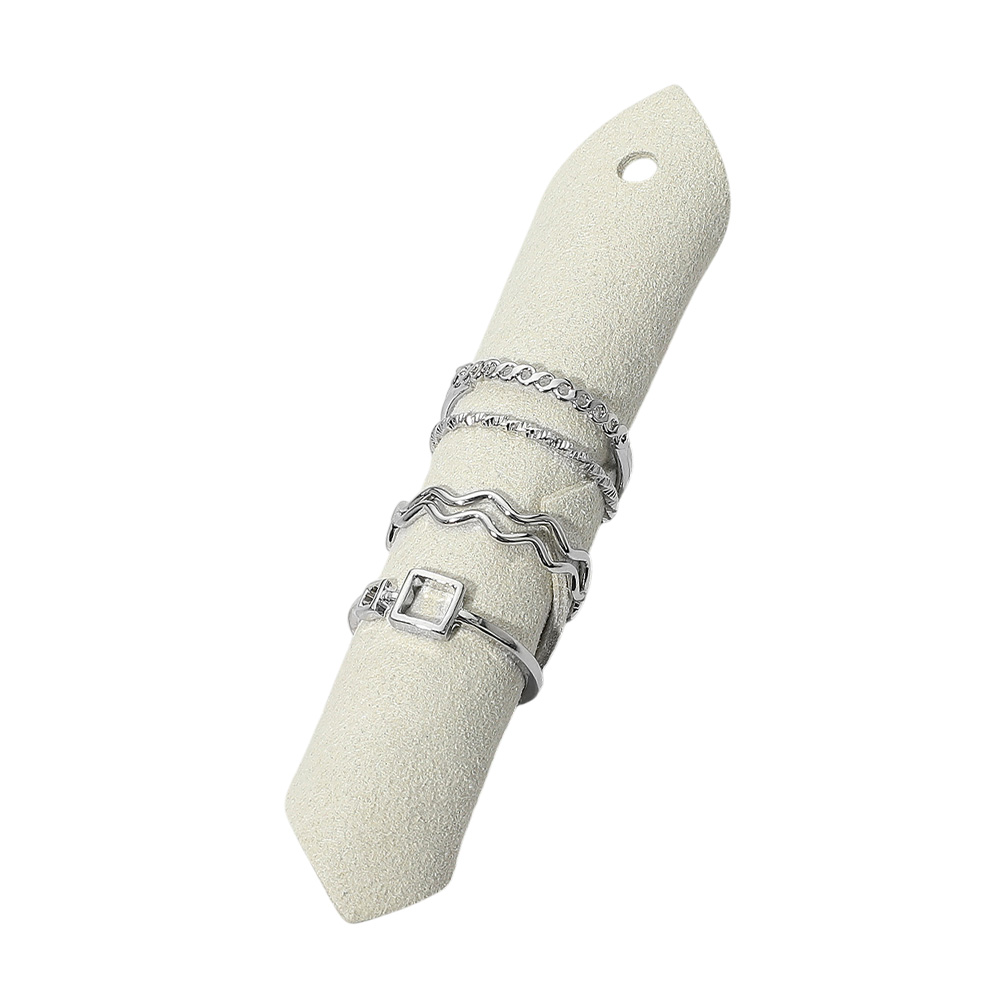 Details • Size : 0.1" - 0.25" H • Size 7 Only • This set of four stackable rings showcases a mix of geometric and textured designs, including chain links, zigzag patterns, and buckle accents. Perfect for layering or wearing individually, they add a versatile touch of modern elegance to any jewelry collection. • Lead and Nickel Compliant
