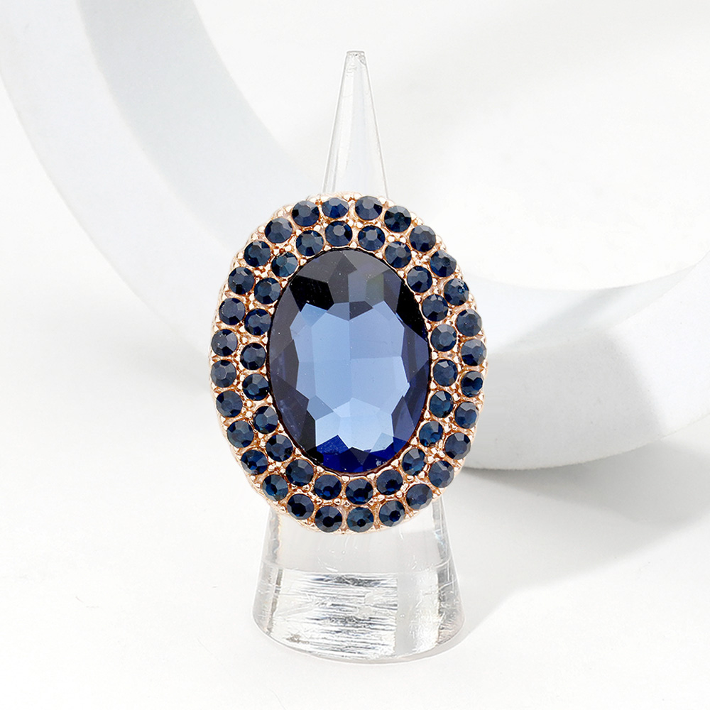 • Elegant oval statement ring featuring a faceted centerpiece surrounded by two rows of shimmering rhinestones. Its refined halo design adds timeless sophistication, making it a standout accessory for special events or everyday elegance with a glamorous, vintage-inspired touch.