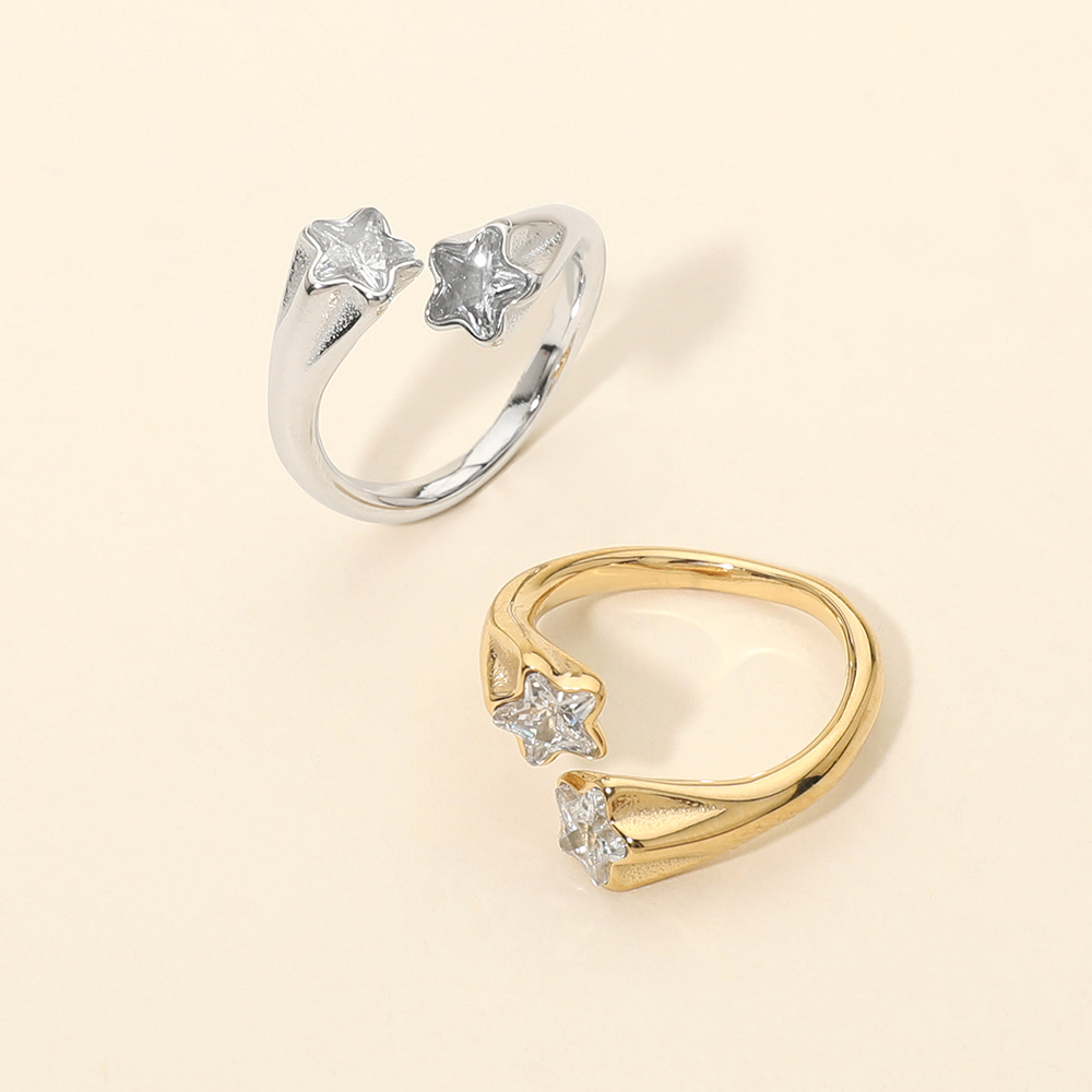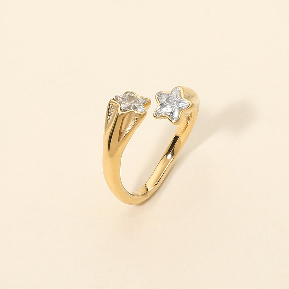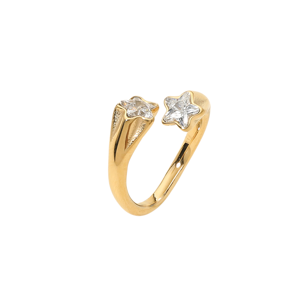 Details • Size : 0.5" H • Adjustable • Water Resistant • Stylish open ring featuring two star-shaped accents for a modern celestial look. The adjustable open band offers a comfortable fit while adding subtle sparkle and dimension. A versatile fashion ring perfect for everyday wear, gifting, and boutique collections inspired by star and cosmic jewelry trends. • Hypoallergenic • Stainless Steel