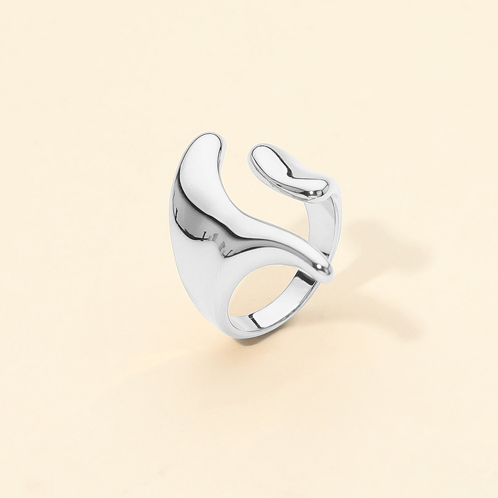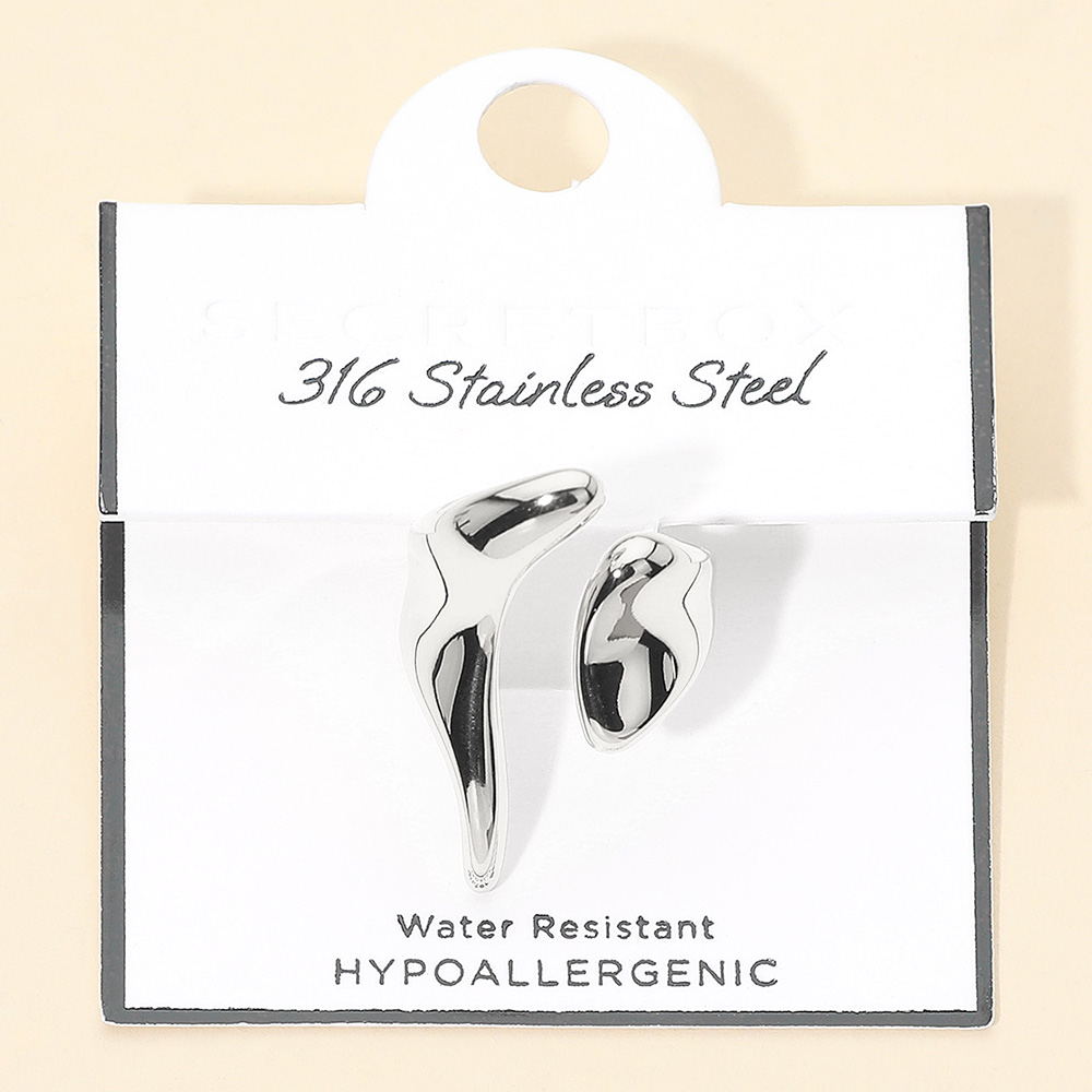 Details • Size : 1.25" H • Adjustable • Water Resistant • Contemporary open wave ring with a fluid sculptural silhouette designed to elevate everyday looks. Its adjustable open style creates a sleek statement that layers beautifully or shines solo, offering clean modern appeal for effortless styling and versatile gifting. • Hypoallergenic • Stainless Steel