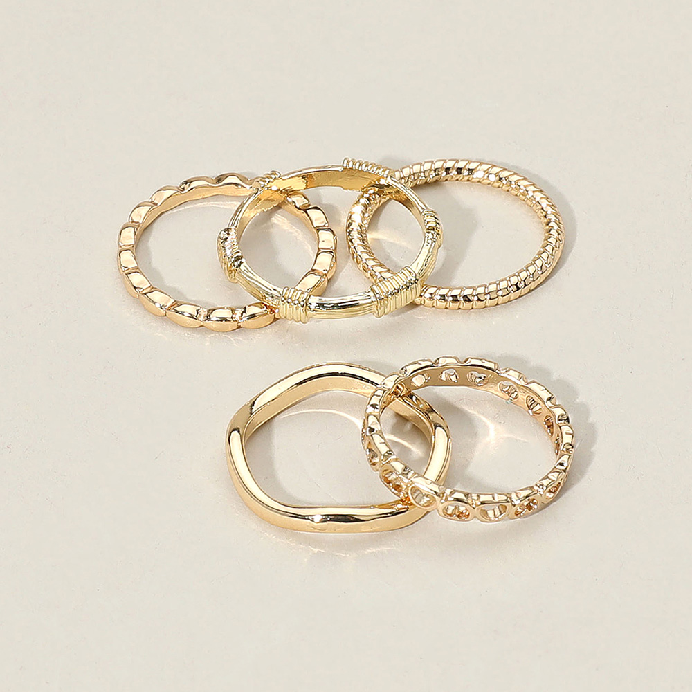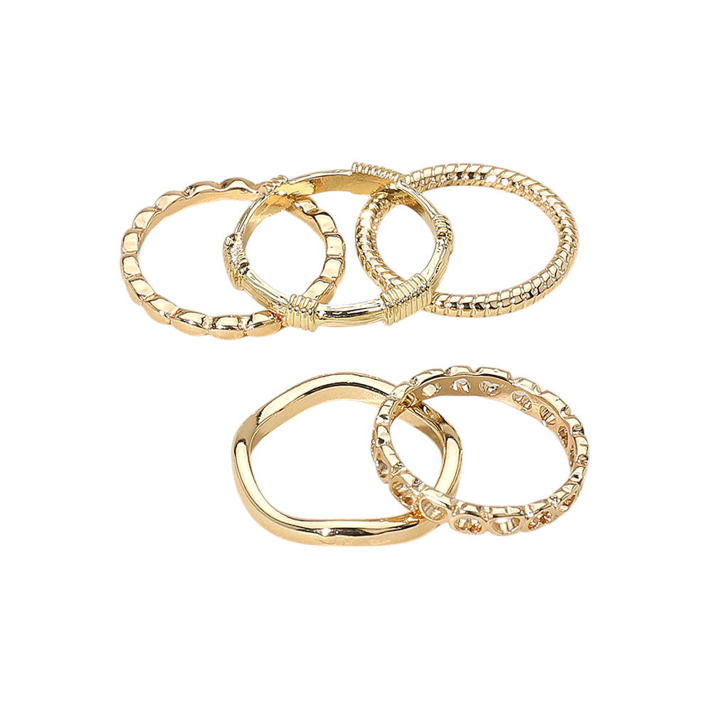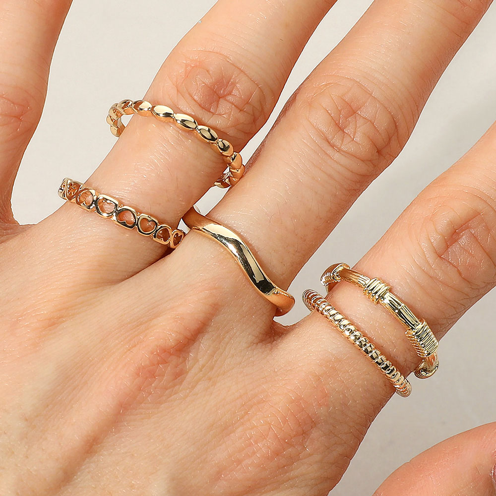 Details • Size : 0.1" H (size 7 Only) • Trendy stackable ring set featuring a mix of minimalist and textured designs. Perfect for creating a layered look or wearing individually, this versatile collection adds a chic touch to everyday outfits and special occasions alike. • Lead and Nickel Compliant