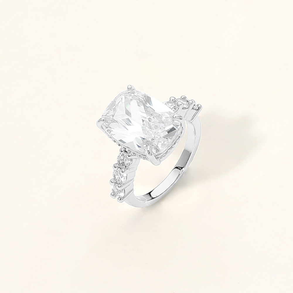 • This statement ring showcases a bold cushion cut CZ centerpiece with refined side accents that add depth and brilliance. Designed for standout style, it elevates everyday looks and special occasion outfits alike. The elegant silhouette makes it perfect worn alone as a focal piece or layered with minimal bands for a polished, fashion-forward finish.