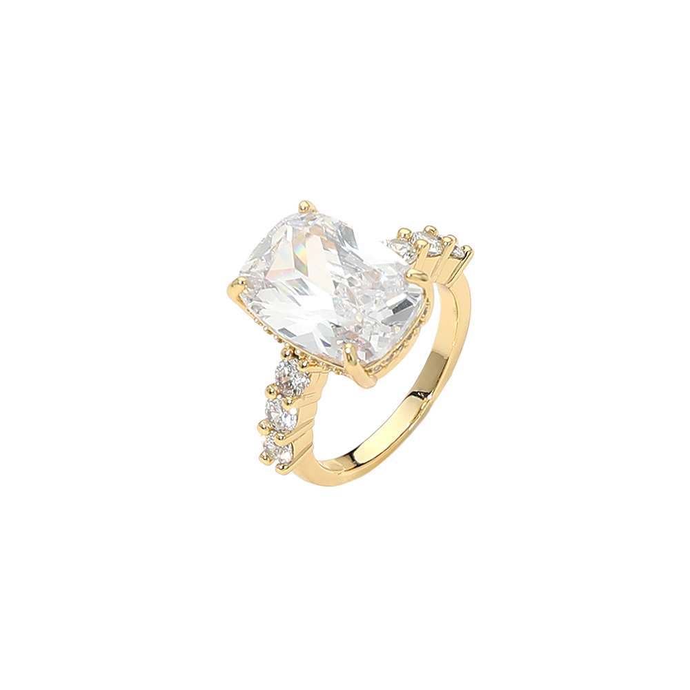 Details • Size : 0.6" H • This statement ring showcases a bold cushion cut CZ centerpiece with refined side accents that add depth and brilliance. Designed for standout style, it elevates everyday looks and special occasion outfits alike. The elegant silhouette makes it perfect worn alone as a focal piece or layered with minimal bands for a polished, fashion-forward finish. • CZ Cubic Zirconia • Lead and Nickel Compliant