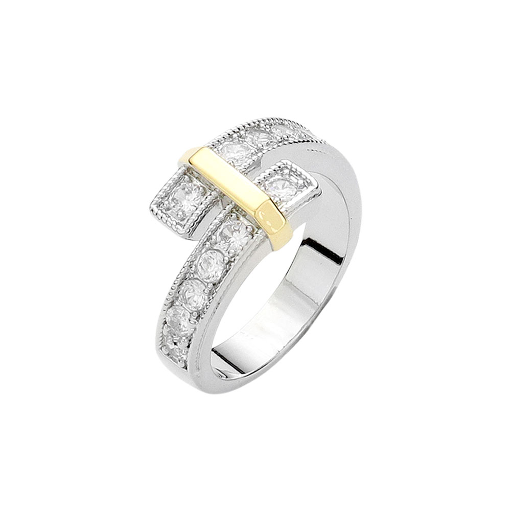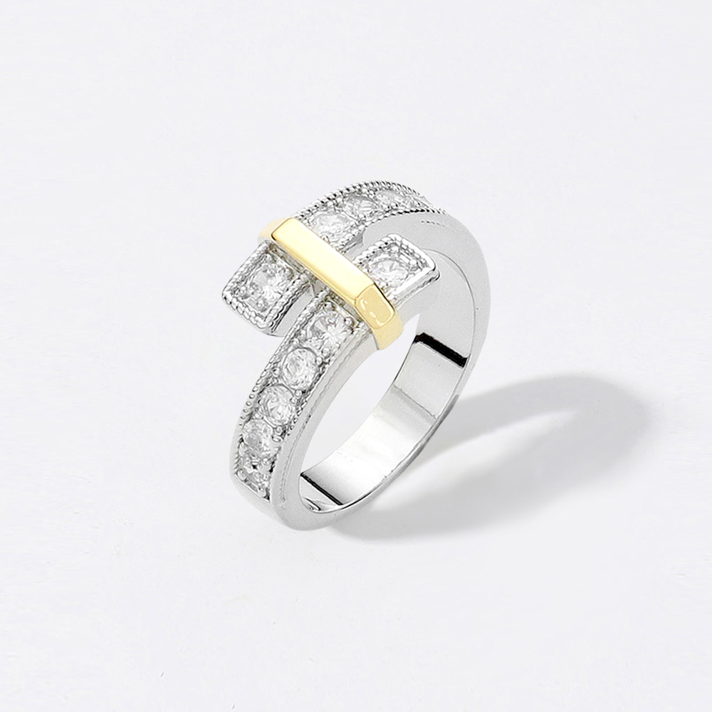 • Modern band ring with a crossover design and sparkling CZ accents. A sleek geometric piece that blends elegance with bold style.