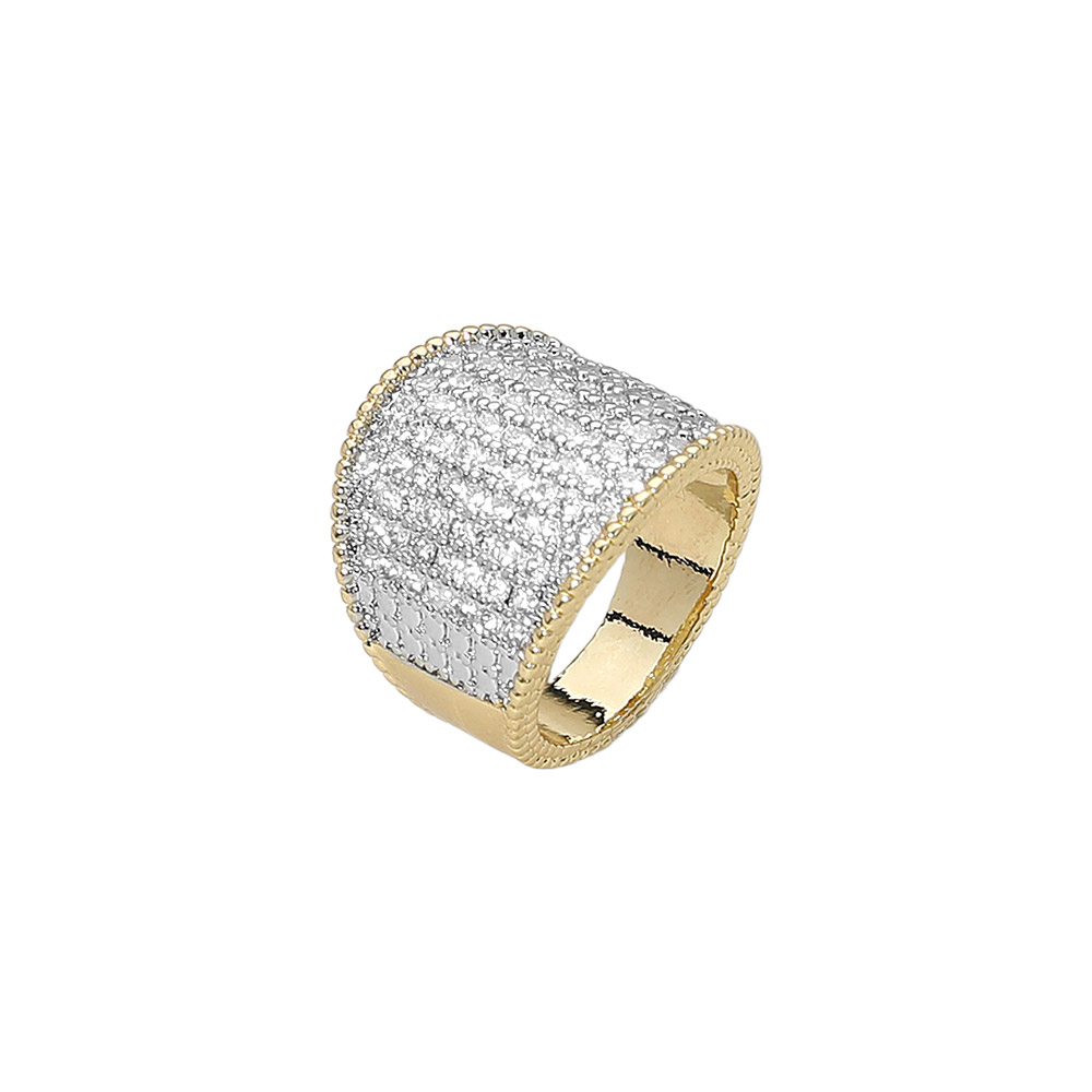 • Bold wide-band statement ring featuring a dome silhouette covered in shimmering pavĂ© stones. Designed with intricate edging and a smooth interior for a comfortable fit, this eye-catching accessory adds refined sparkle and elevated style to any look.