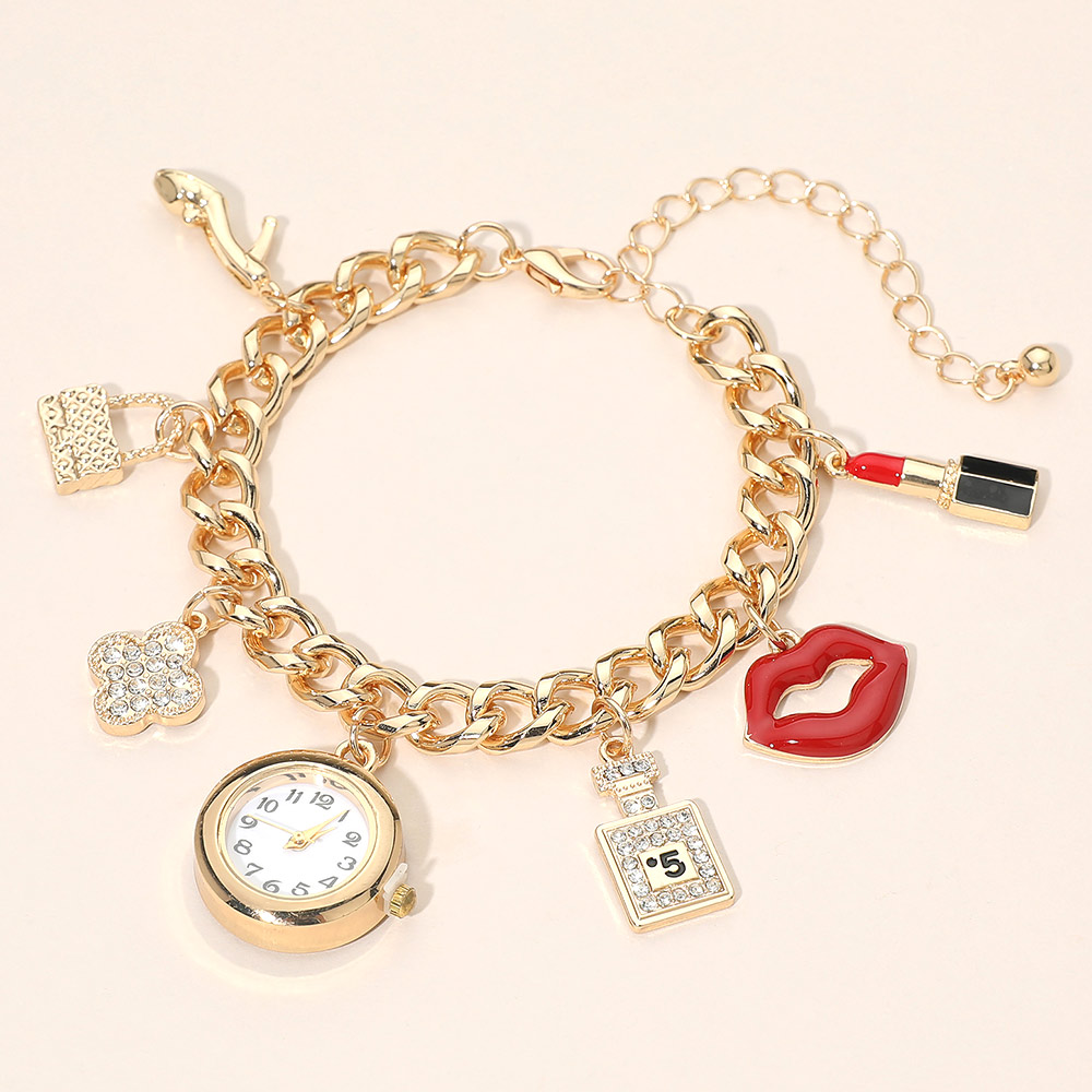 Silver Dipped Quatrefoil High Heel Lips Lipstick Charm Watch Bracelet