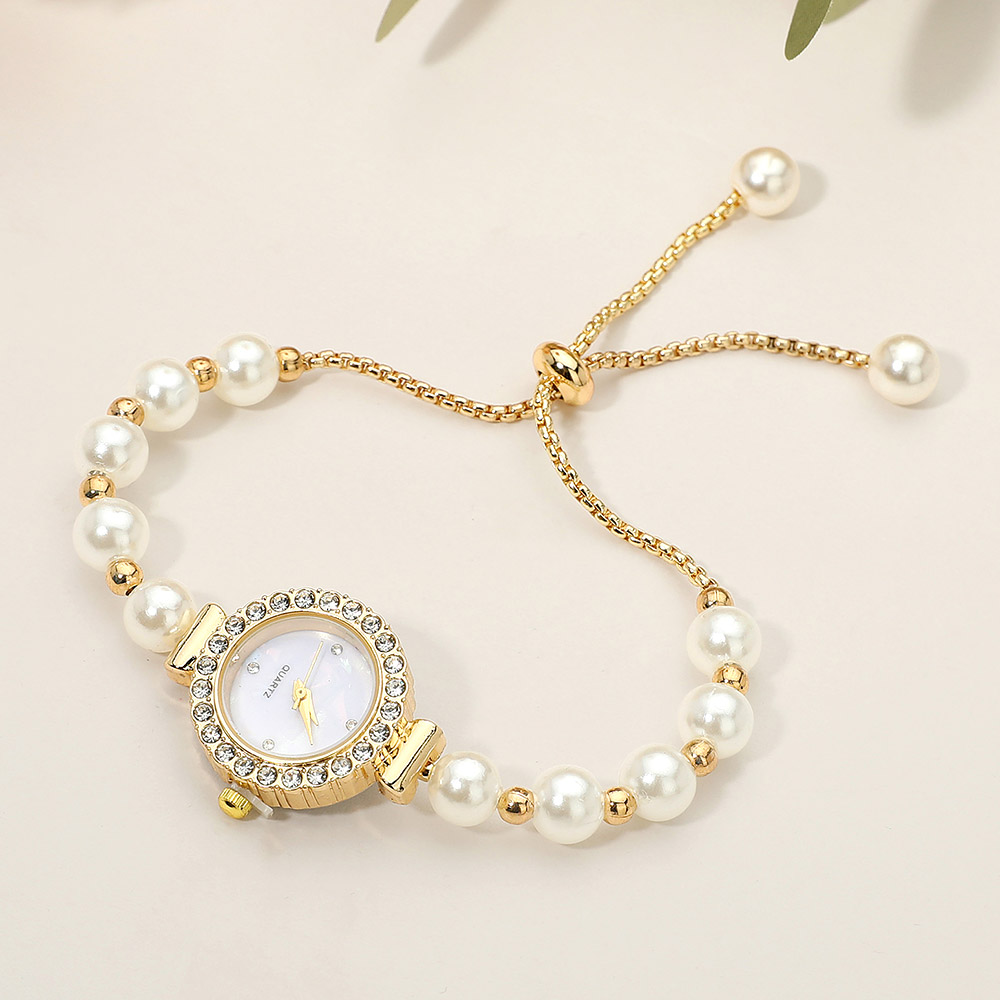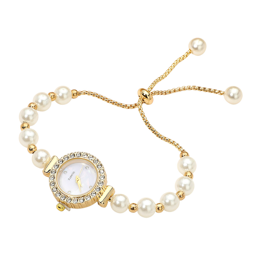 Details • Size : 0.9" H, 10" L • Adjustable • Water Resistant • Delicate and versatile, this adjustable quartz watch features a pearl-accented strap with a sliding closure for a perfect fit. Its crystal-lined bezel and refined round dial bring timeless charm, making it an elegant accessory for both casual wear and formal occasions. • Stainless Steel