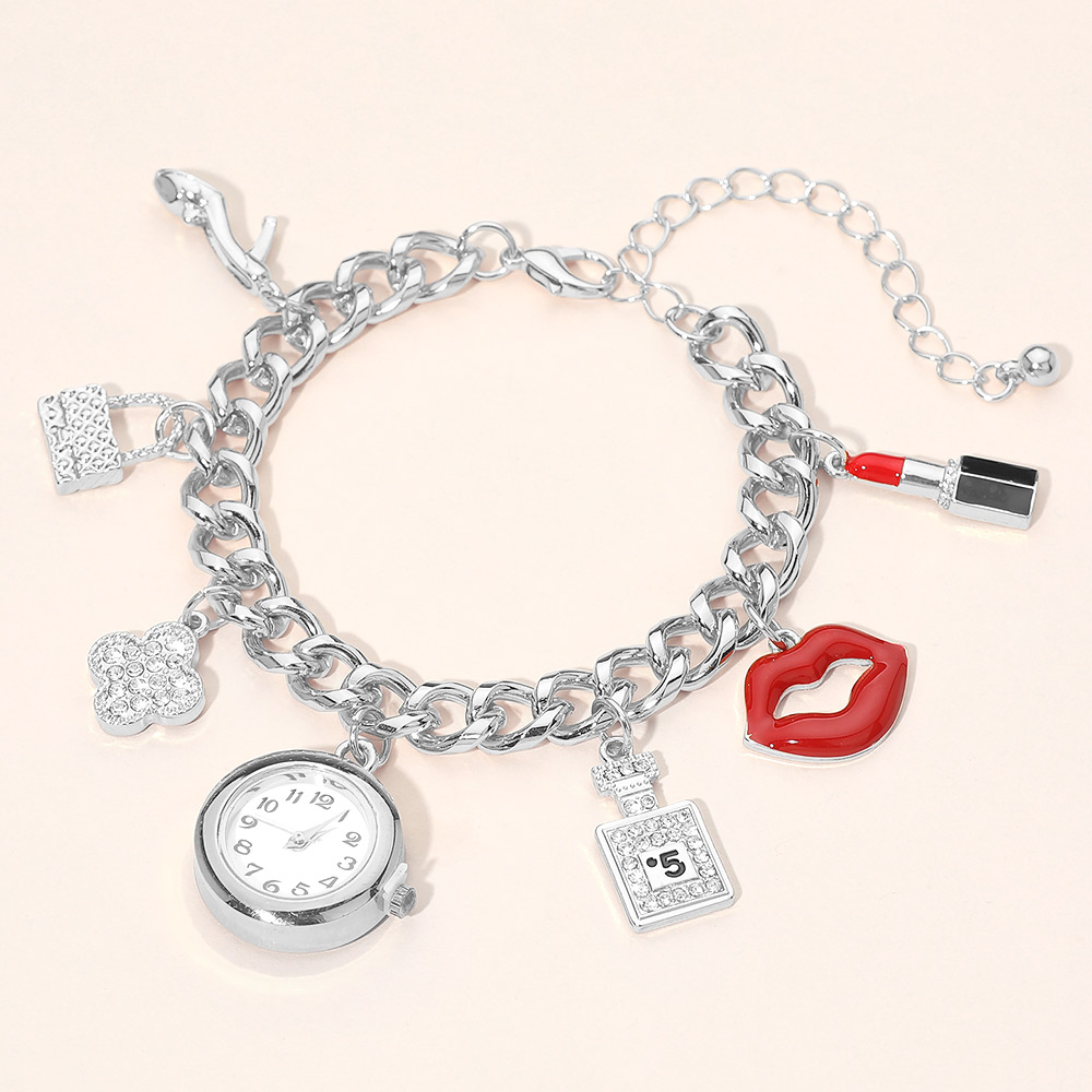 Silver Dipped Quatrefoil High Heel Lips Lipstick Charm Watch Bracelet