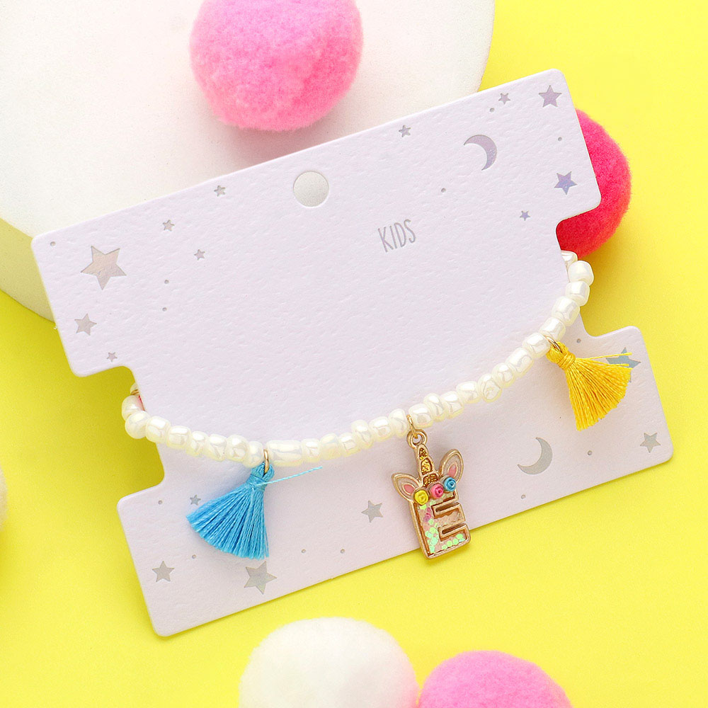 -K- Unicorn Initial Monogram Tassel Station Kids Beaded Stretch Bracelet