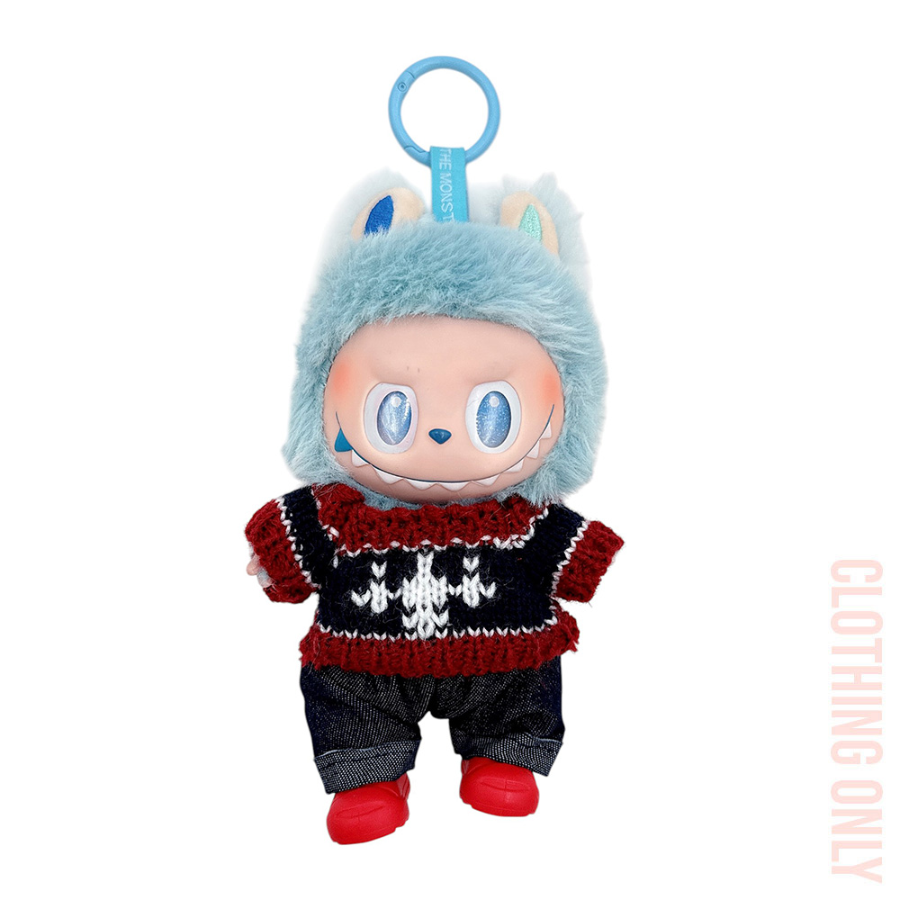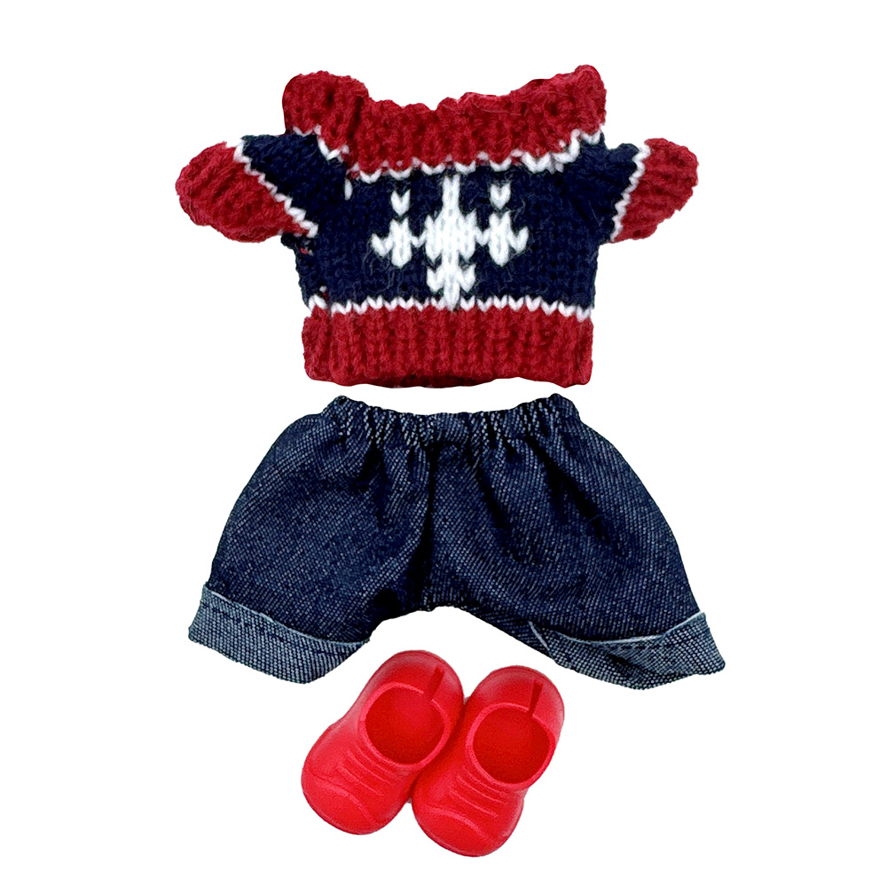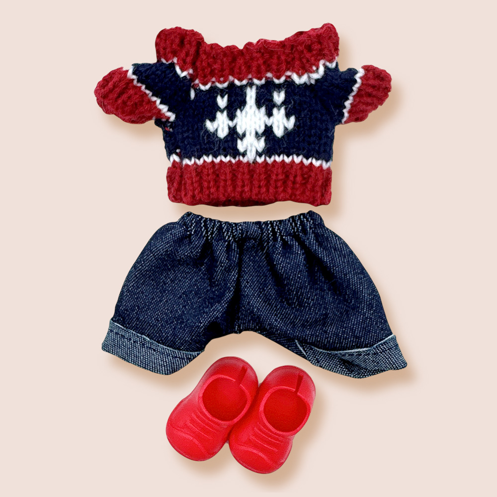 Details • Size : One Size • Knit top, denim shorts and shoes included • Labubu Doll Compatible • Doll NOT Included • Material : 100% Polyester • Add cozy charm to playtime with this doll outfit set featuring a knit patterned top, denim shorts, and matching shoes. Perfect for casual styling and imaginative storytelling, this set brings a fun and fashionable look to any doll’s wardrobe collection.