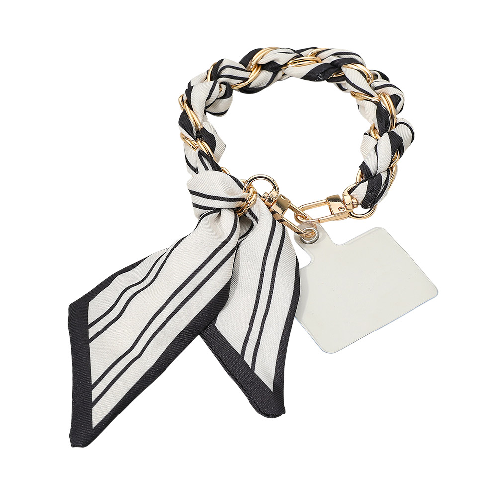 • Upgrade your phone style with this elegant scarf chain wrist strap, combining a braided design with metallic links for a chic and functional look. The soft scarf accent adds flair while providing a comfortable grip, making it perfect for carrying your phone in effortless fashion.