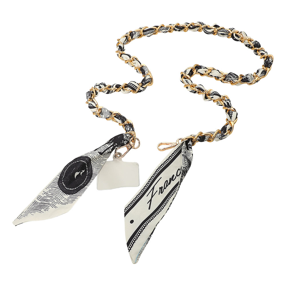 • Add a chic touch to your phone with this patterned scarf chain strap featuring an elegant border design and gold chain accents. Lightweight yet durable, it offers hands-free convenience and timeless style—perfect for elevating your everyday look or keeping essentials close in style.